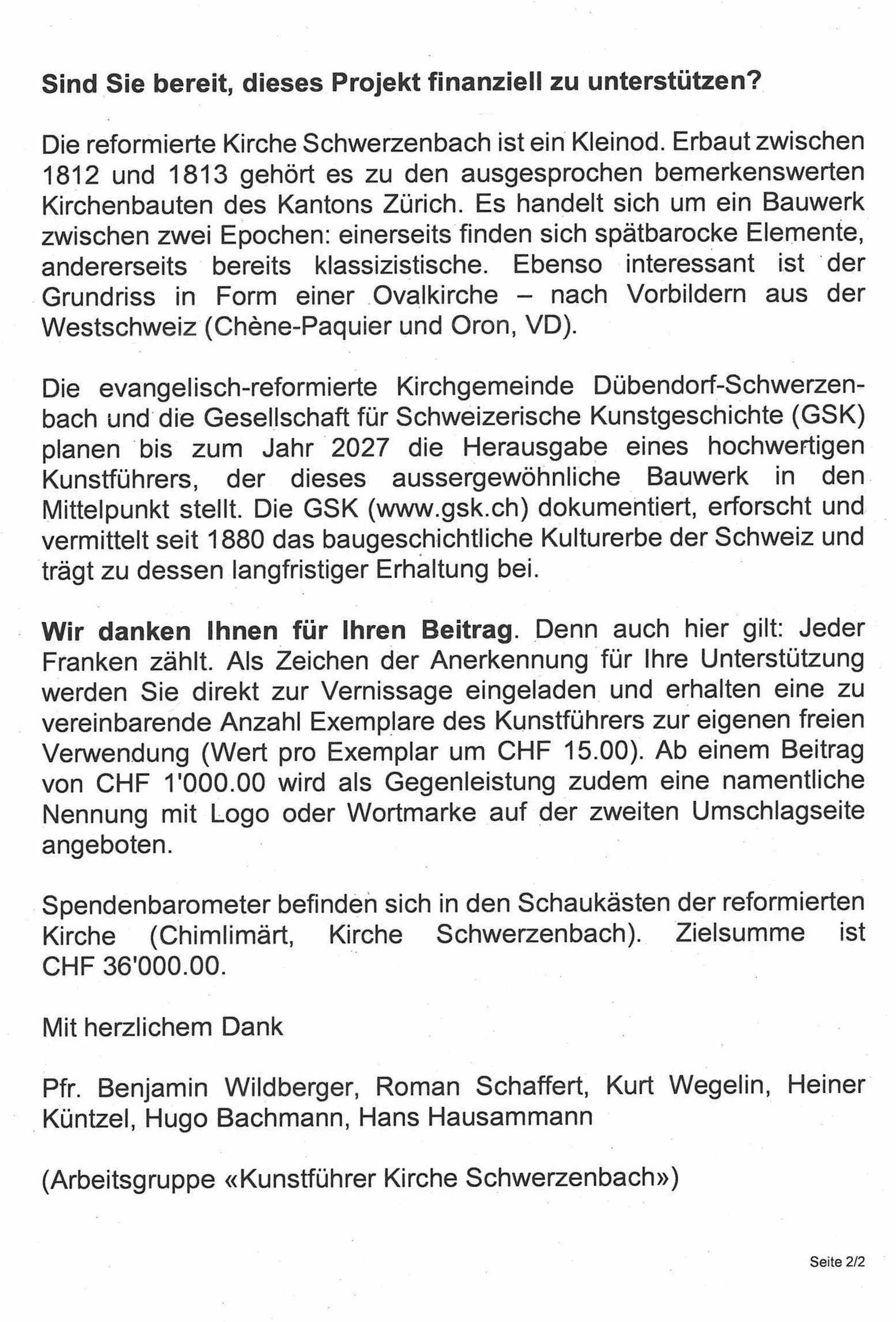 Flyer Kunstführer Kirche Schwerzenbach Spendenanfrage Seite 2